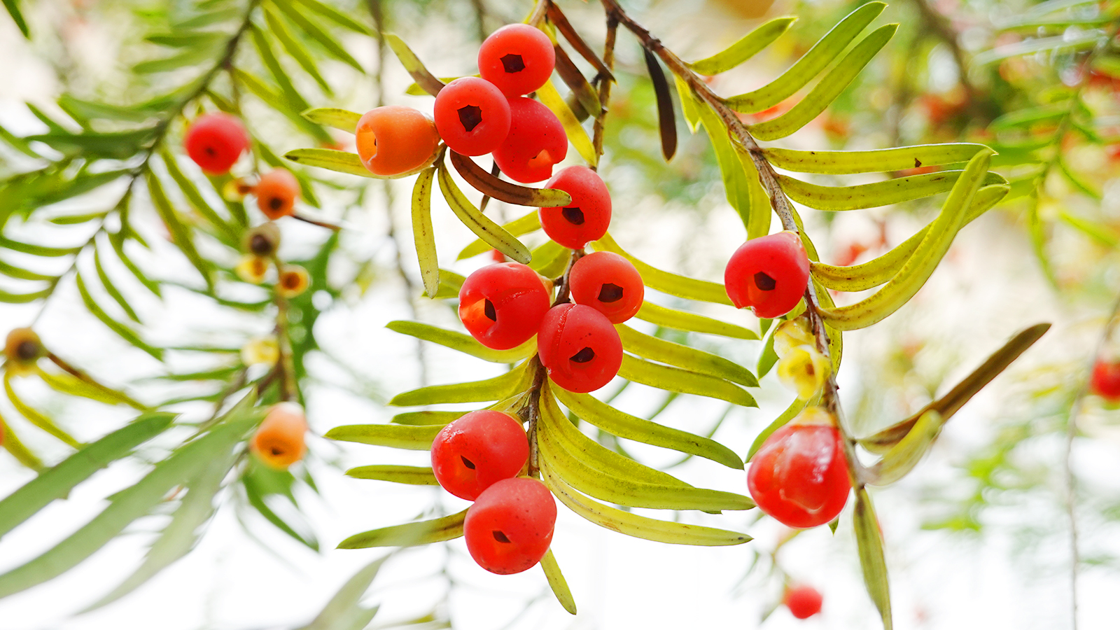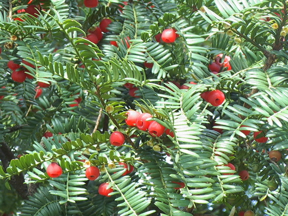 红豆杉是红豆杉科红豆杉属一种常绿乔木或灌木,植株可高达30米。叶披针形或针形,螺旋状排列或交互对生;雌雄异株;雄球花常单生或成穗状花序状;雌球花单生或成对;种子浆果或核果状,包被于肉质假种皮中;花期2~3月,果期10~11月。秋天会长出樱桃大小的红色豆形果实,因此而得名。